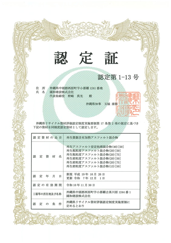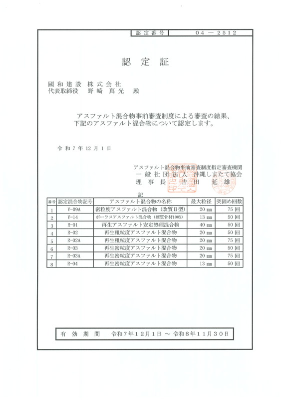 厳格な基準をクリアし、アスファルト合材製造における認定証を取得しています。この認定証は、製造過程が高い品質管理のもとで行われ、製品が安全かつ信頼性のあるものであることを証明するものです。